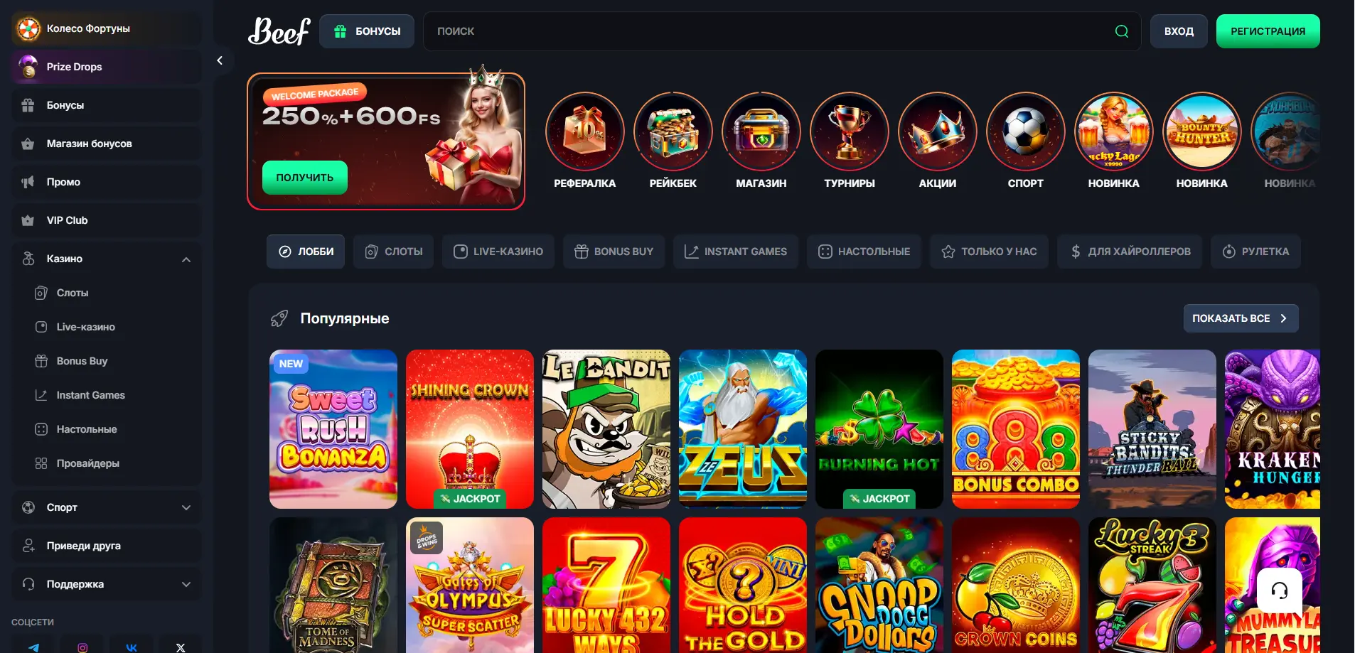 Beef Casino — это новое казино в Казахстане, запущенное в 2025 году компанией GALAKTIKA N.V. и работающий по лицензии Кюрасао. Платформа предлагает впечатляющий выбор из более чем 12 000 игр, включая свыше 800 столов с живыми дилерами от 96 ведущих провайдеров. Интерфейс доступен на русском, английском и немецком языках, а счет можно открыть в RUB, KZT, UAH, USD и EUR.